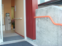 旧診療所では2階の診療スペースに上がる急な階段が時代にマッチしなくなっていました。新診療所は、ユニークな手すり付きの緩やかな階段を数段上がると入口になります。土足入室ですので、靴を脱がずにそのままお入りください。また、院内の主要な場所には手すりが付いており、扉の敷居には段差がないのでスムーズに移動できます。