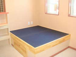 当院唯一の土足禁止スペースで、大人が椅子として使用する事も出来ます。受付横で目の届く場所にあり、ジーンズ生地の畳をひいてあるのでクッション性に優れ、転んでも衝撃が吸収されます。また、下の引き出しにはおもちゃが収納されていますので必要な場合はお声をおかけください。