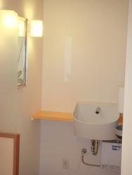 WC用とは別に、水はねの少ない大型の手洗い用シンクがあります。胡蝶蘭を彫りこんだモダンな鏡と荷物置き場が側面に置かれ、治療前のブラッシングや治療後のメイク直しにご利用いただけます。
