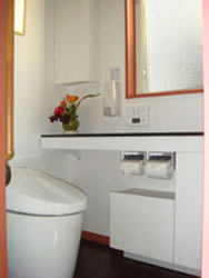 入口すぐ左手にあります。部屋のライト、ふたの開閉、便器の洗浄、使用前後の除菌水のミストが自動で作動します。ウォシュレットも装備され、天井には消臭効果がある炭ボードを使用していて、清潔で快適なトイレ環境が実現されています。