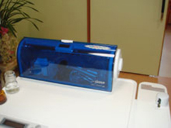 また、治療テーブルに置かれた器具が汚染されないように殺菌灯付きのケースを使用しています。